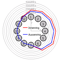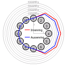 Während beim starren Ring die Pressung von der Lastrichtung unabhängig ist, ergibt sich beim elastischen Ring eine Abhängigkeit von der Kraftrichtung: