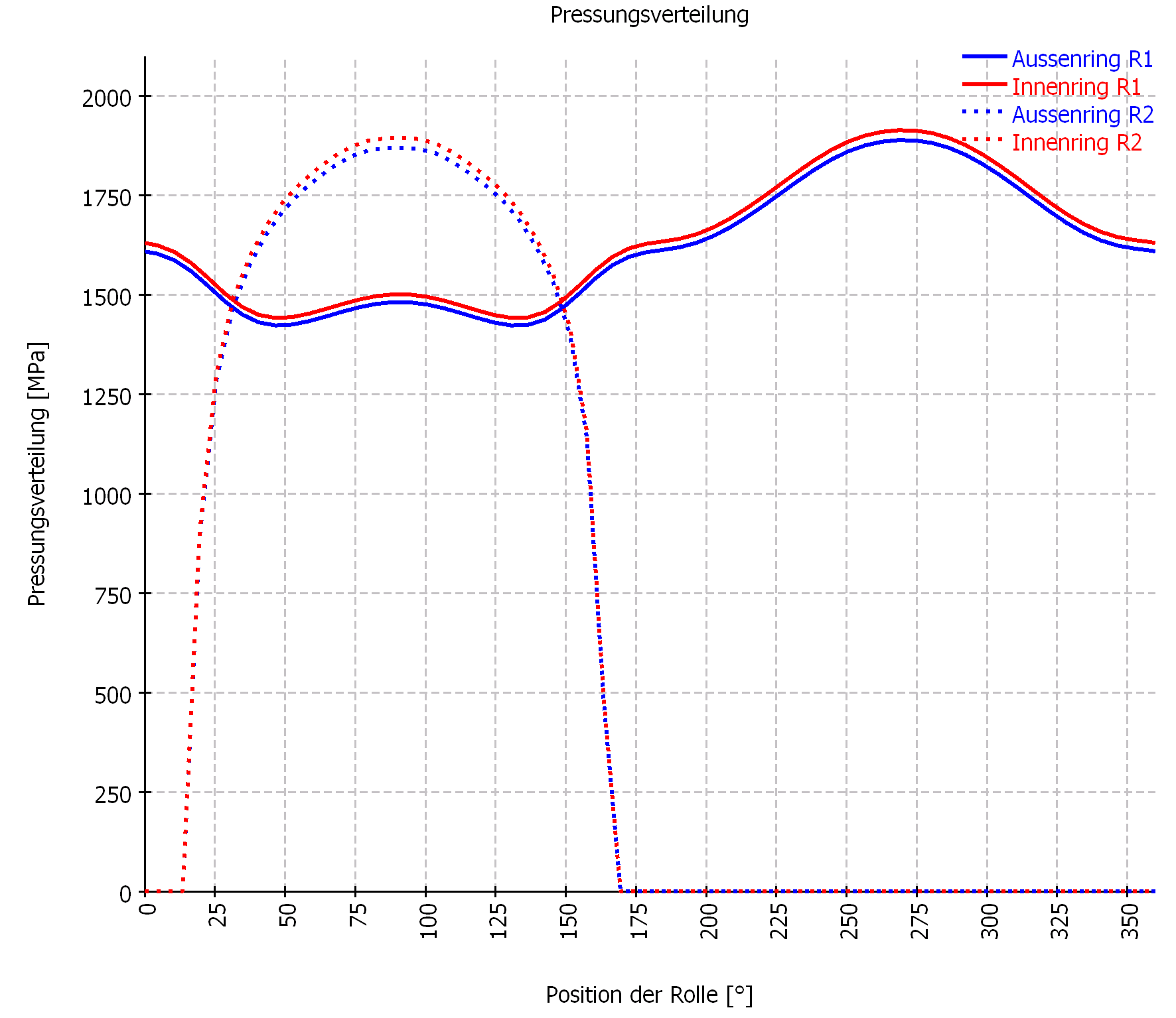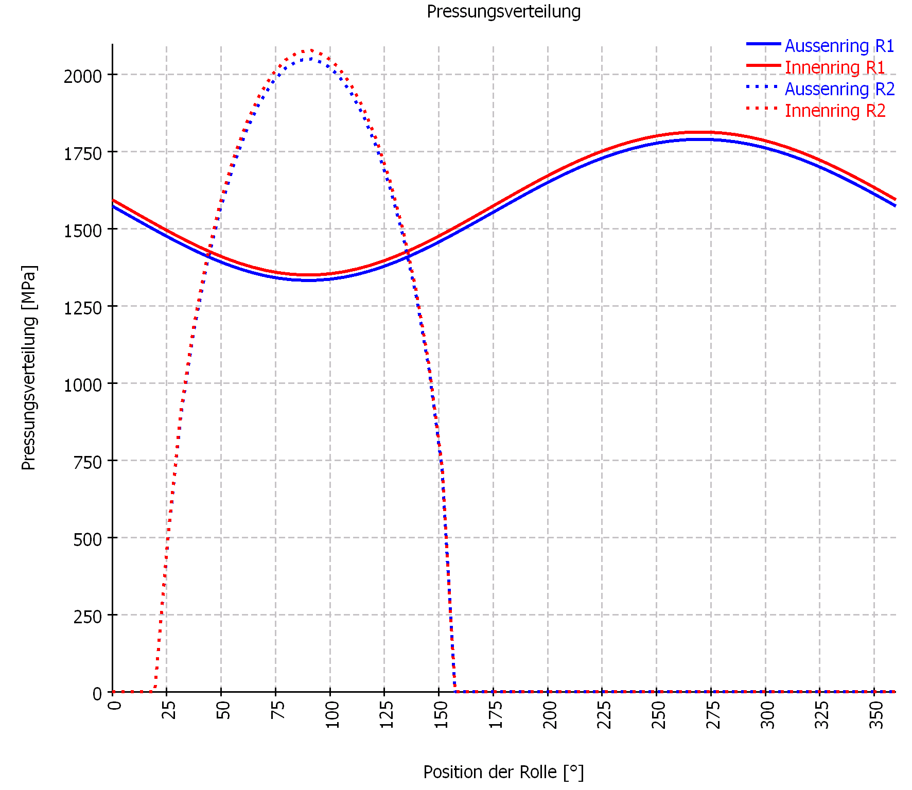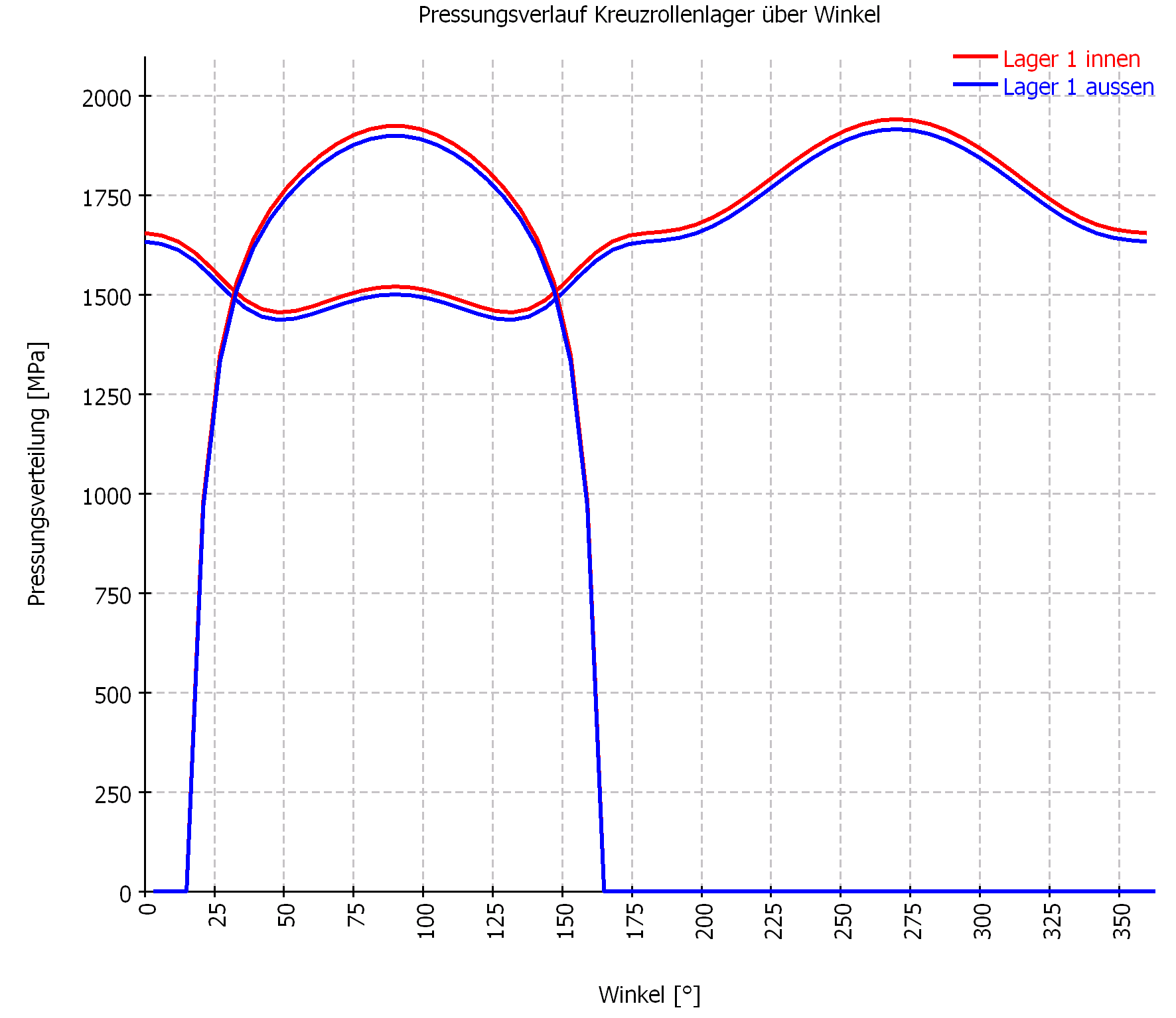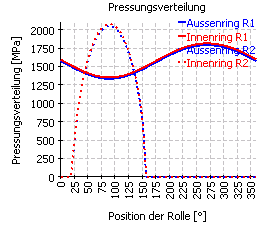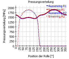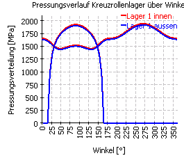 Mit Winkel 0° (Kraft nach oben) ergibt sich die geringste Pressung, mit etwa 110° die höchste Pressung. Die überlagerten Schwankungen im Pressungsverlauf ergeben sich, da die Berechnung mit festen Positionen der Wälzkörper durchgeführt wurde.